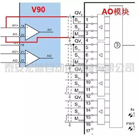 AO 模塊輸出+-10V 電壓信號,針對于第 0 通道 1、2 端子短接后連接 V90 X8 端口的 19 端子,3、4 端子短接后連接 V90 X8 端口的 20 端子。