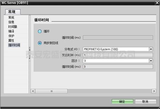 OB91 是 S7-1500 運動控制的核心組織塊,為了更好的實現(xiàn)運動控制功能,需要把OB91 的循環(huán)時間同步到總線。具體操作過程是鼠標在 OB91 上點擊右鍵,在彈出的菜單中選擇屬性,就會彈出以下頁面。在頁面中選擇“同步到總線”??筛鶕?jù)應用情況選擇“因子”,增加“因子”可減輕 CPU 負荷,但會影響控制效果。