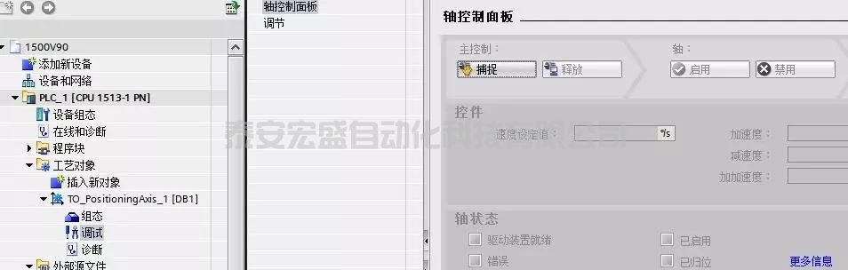 至此 S7-1500 與 V90 的組態(tài)配置與接線都已經(jīng)初步完成,可以打開工藝對象的調(diào)試界面進行調(diào)試,然后就可以編寫控制程序了。具體內(nèi)容可參考幫助文檔,這里不再詳述。