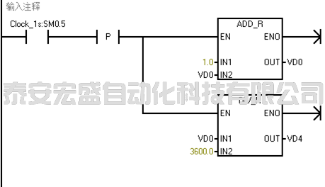 在另外一些應(yīng)用場景中,有時需要記錄現(xiàn)場設(shè)備的運行時間,一般情況下我們可以使用定時器來實現(xiàn)計時的功能,但S7-200 SMART定時器有數(shù)量限制(最大256個),并且最大時基為100ms的定時器其所能達到的最大計時長度為3276.7S,若想實現(xiàn)小時或者天的計時就需要定時器加計數(shù)器來實現(xiàn),而計數(shù)器也有數(shù)量限制(最大256個),當需要類似的功能很多時,計數(shù)器和定時器數(shù)量就不夠用了,此時可以使用系統(tǒng)特殊存儲器 SM0.4(周期為60S的時鐘脈沖)和SM0.5(周期為1S的時鐘脈沖)來實現(xiàn)計時功能。