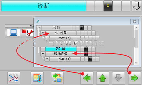 此時點擊右按鈕進入“PC 站“畫面后,因為”PC 站“畫面并列有三個畫面,且其位于中間,則左右按鈕均可操作,分別用于進入”AS 對象“和”現(xiàn)場設(shè)備“畫面。