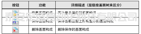 前面介紹的兩個功能雖然方便,但是用戶切換時會刪除之前的畫面存儲器和畫面堆棧難以滿足一些特殊場合需要。而且有些現(xiàn)場可能會在過程畫面的基礎(chǔ)上打開若干個畫面窗口或面板,希望可以保存當前的畫面構(gòu)成。按鈕區(qū)的另外三個按鈕這是為這種需求而生,可以將當前的畫面構(gòu)成保存,后續(xù)調(diào)用。而且支持保存多個畫面構(gòu)成,用戶切換時不會丟失(但是只針對保存畫面構(gòu)成的用戶生效,即創(chuàng)建者登陸后方可查看)。