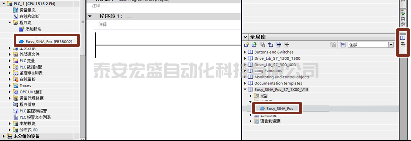 3.在TIA 博途中添加庫文件,并將庫中的Easy_SINA_Pos功能塊拖拽到左側(cè)"程序塊"中