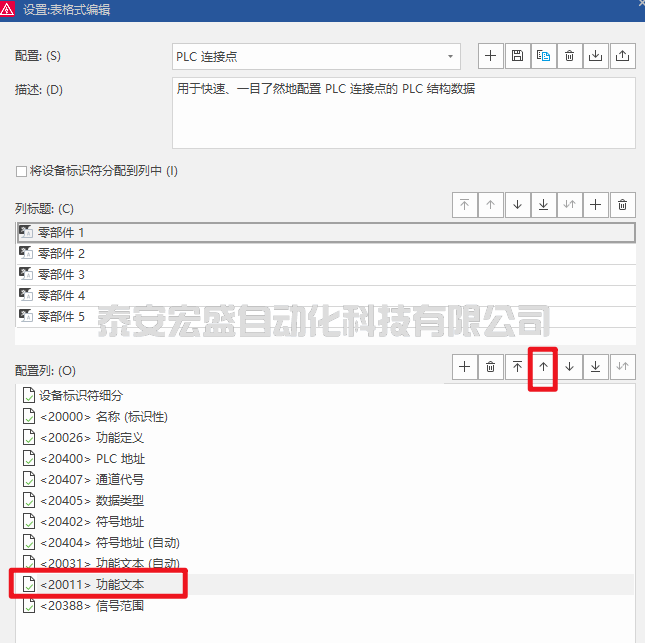 在“設(shè)置:設(shè)置表格式編輯”對(duì)話框,可以對(duì)配置列進(jìn)行移動(dòng)調(diào)整,也可以增加其他顯示屬性。當(dāng)前項(xiàng)目需要將功能文本調(diào)整到配置的第四列,選中功能文本,然后向上移動(dòng)到第四行即可,如下圖所示。