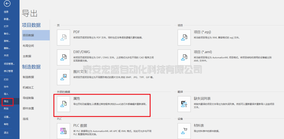 1. 執(zhí)行導(dǎo)出:在本例中我們針對(duì)K1的PLC地址進(jìn)行編輯,需要在PLC導(dǎo)航器中選中K1,然后打開(kāi)后臺(tái)視圖,點(diǎn)擊文件→導(dǎo)出→外部的編輯→屬性,如下圖所示。
