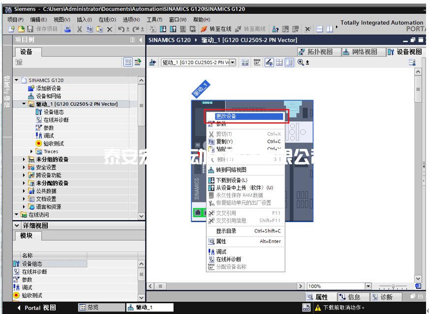 使用Startdrive打開原有的 G120 項目文件,在“設備視圖”中右鍵點擊控制單元,選擇“更改設備”,如圖2所示。