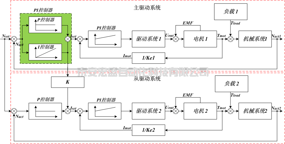 據(jù)此提出如下的主從控制方案:主機速度調節(jié)器為PI控制+從機速度調節(jié)器為P控制,且將主機速度調節(jié)器的積分控制分量傳遞給從機做轉矩補償。