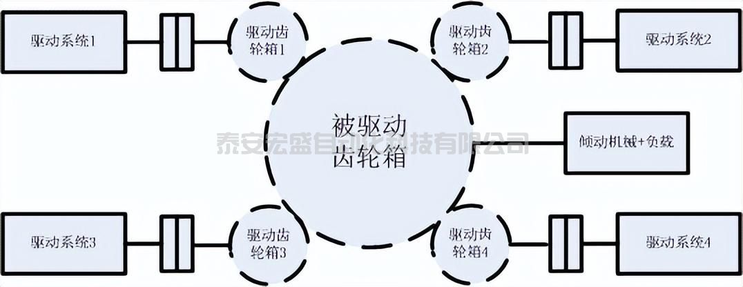 圖中展示了4套驅動系統(tǒng)通過齒輪嚙合,共同驅動傾動機械及負載(爐內鋼水)。其控制目標是4臺電機轉速一致,負荷均勻分布。但是,由于齒輪嚙合方式帶來的問題是齒隙,如圖7所示。