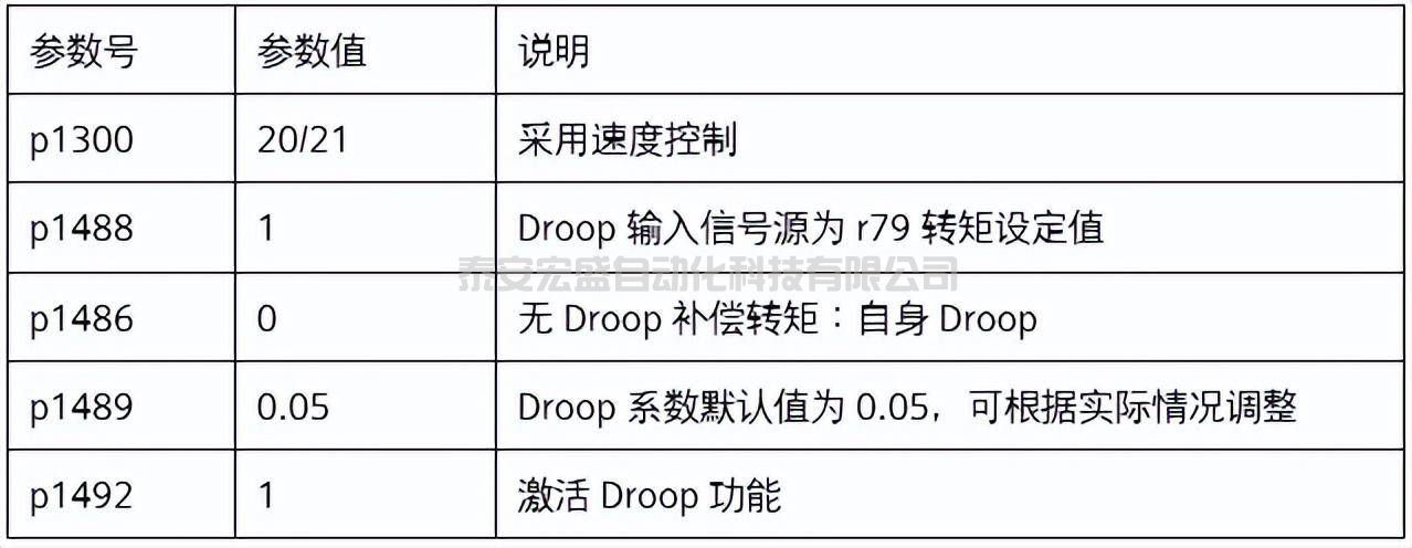各臺變頻器各自采用Droop的方式,各自轉矩設定值作為Droop輸入信號源,相關參數(shù)設置如下:
