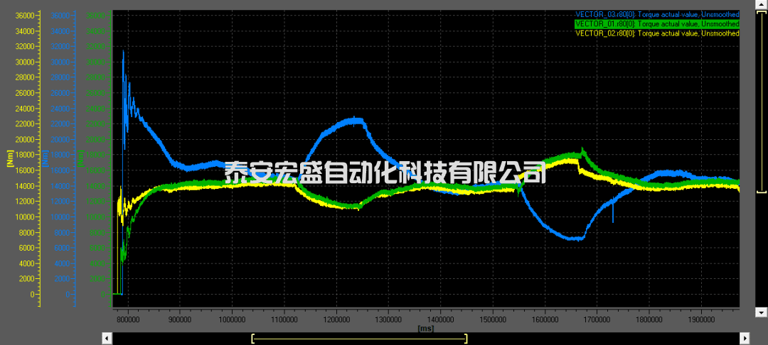 實際測試效果能夠很好的滿足工藝要求,啟動過程中皮帶平穩(wěn)建立張力,然后進入穩(wěn)定的勻速運行。設備運行過程中3臺電機的輸出轉矩曲線如下圖所示: