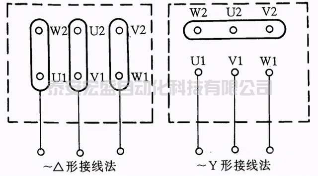 目前,Y系列電動機被廣泛應用。Y系列電動機具有體積小、外形美觀、節(jié)電等優(yōu)點。它的接線方式有兩種:一種為△形,它的接線端子W2與U1相連,U2與V1相連,V2與W1相連,然后接電源;另一種為Y形,接線端子W2、U2、V2相連接,其余3個接線端子U1、V1、W1接電源。接線見圖6。