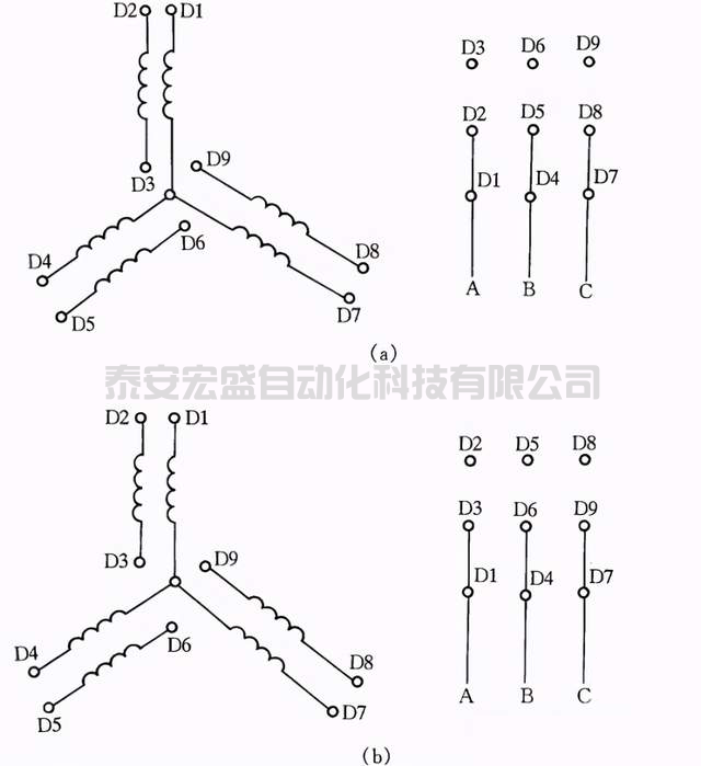 圖8所示是2Y/2Y電動機雙速定子線組的引出線接線方法。按圖8(a)連接是一種轉(zhuǎn)速,按圖8(b)連接得到另一種轉(zhuǎn)速。
