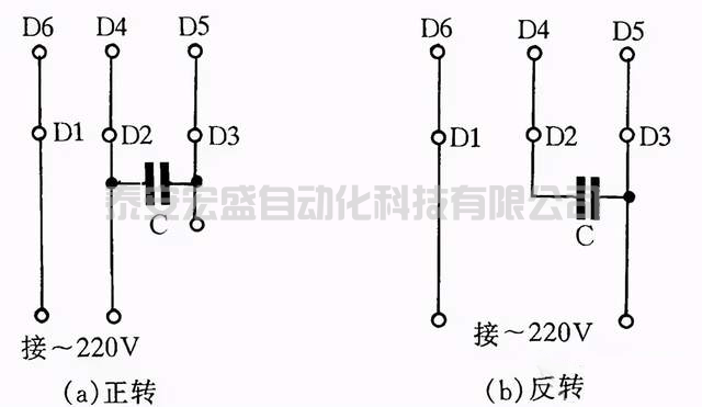 圖247為IDD5032型單相電容運轉(zhuǎn)電動機接線方法。其功率為60W,電容選用耐壓500V、容量為4μF的產(chǎn)品。圖3(a)為正轉(zhuǎn)接線,圖3(b)為反轉(zhuǎn)接線。