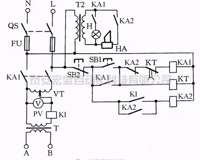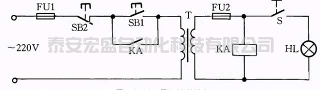 工作原理:閉合S后,按下按鈕SB1,變壓器得電輸出36V低電壓,使得繼電器或交流接觸器KA吸合。放松按鈕SB1后,KA自鎖觸點使KA保持吸合,繼續(xù)給變壓器接通電源。如果變壓器次級發(fā)生短路故障,繼電器線圈電壓為零,此時KA便失電釋放,將變壓器電源斷開,保護變壓器不被破壞。