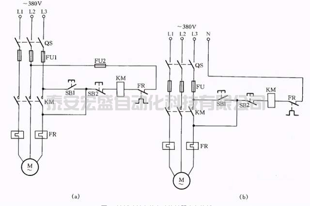 接觸器線圈電壓為380V時,可按圖12(a)所示接線;接觸器線圈電壓為220V時,可按圖12(b)接線。圖12(a)的接線還有缺陷,即在電動機停轉(zhuǎn)時,其引出線及電動機帶電,使維修不大安全。因此,這種線路只能在應急時采用,并在維修電動機時,應斷開控制電動機的總電源開關QS,這一點應特別注意。