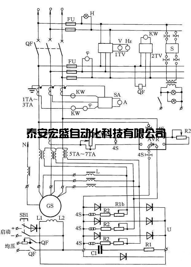 HF-4-81系列發(fā)電機控制線路如圖15所示,它與T2XV系列小型三相同步發(fā)電機配套。同步發(fā)電機的勵磁系統(tǒng)采用電復合相復勵調(diào)壓。發(fā)電機端電壓經(jīng)線性電抗器L移相,然后與發(fā)電機負荷電路中的電流互感器5TA~7TA二次電壓合成,經(jīng)三相橋式整流器整流后,供發(fā)電機GS勵磁自動調(diào)壓。