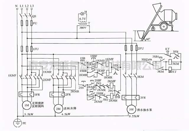 此時操作人員按下下降按鈕2SBR時,卷揚系統(tǒng)帶動料斗下降,待下降到其料口與地面平齊時,擋鐵碰撞行程開關3SQ,使2KMR接觸器斷電釋放,自動停止下降,為下次上料做好準備,這時攪拌機料已備好,操作人員再按下3SB1,3KM接觸器得電吸合,使供水抽水泵電動機3M運轉(zhuǎn),向攪拌機內(nèi)供水,與此同時,時間繼電器KT得電工作,待供水與原料成比例后(供水時間由KT時間繼電器調(diào)整確定,根據(jù)原料與水的配比確定),KT動作延時結(jié)束,從而使3KM自動釋放,供水停止。