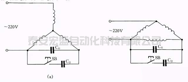 如圖19所示:圖(a)為Y形接法電動機連接方法,圖(b)為△形接法電動機連接方法。為了提高啟動轉(zhuǎn)矩,將啟動電容CQ在啟動時接入線路中,在啟動完畢后退出。
