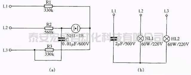 第二種方法是:用一只2μF、耐壓為500V的電容和兩只相同功率(220V/60W)的白熾燈泡,便可做成一個交流電源相序指示器,見圖25(b)。