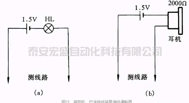 圖27(a)、(b)是最簡便的線路通斷檢測器。當測得導線通路時,燈泡會發(fā)光,耳機在通斷瞬時會發(fā)響;當線路斷路時,耳機不響,燈泡不亮。這種方法簡單易行,非常適合初學電工制作工具儀表或代替萬用表做測量,其優(yōu)點是攜帶方便。