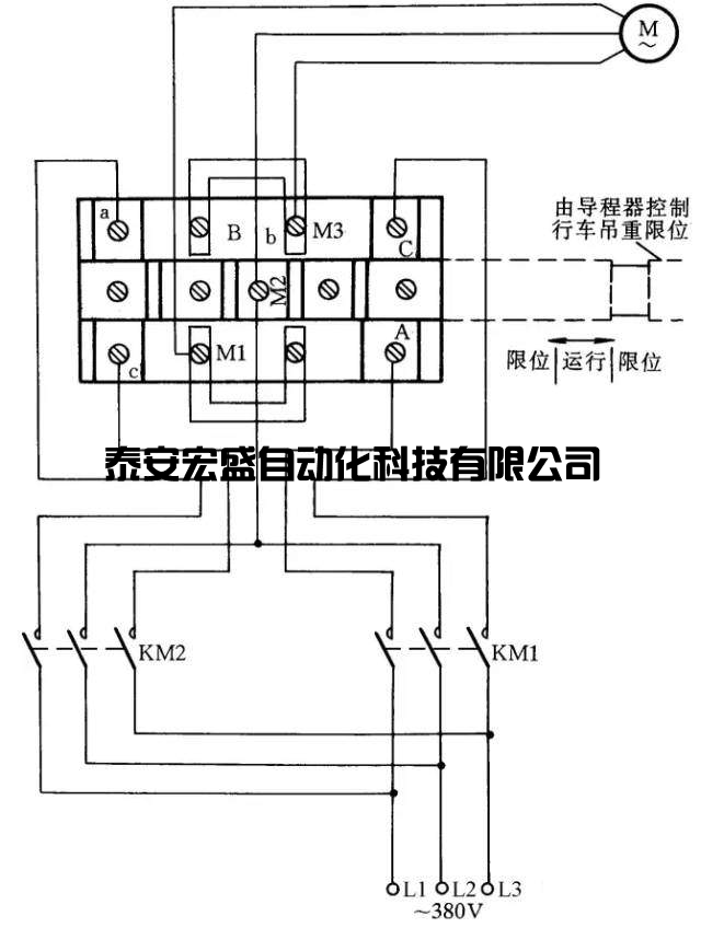 車間安裝的行車、吊葫蘆的起重電動機上,往往需安裝保護限位裝置,在電動機通電后,避免人為操作失誤或接觸器觸點粘連或鐵芯極面臟而不釋放造成超上限或超下限工作。因此,限位器在工廠和企業(yè)應用極為廣泛。這里介紹一種常用限位器接線方法,這種限位器主要用于行車的上下電動機限位。當?shù)蹉^高于限制位置時,它會使電動機自動斷開電源。這種方法一般是斷開主電機電源線,而不是用控制線控制接觸器通斷電動機停止限位,其優(yōu)點是萬一接觸器觸點熔在一起不能斷開時,限位器同樣能起到保護限位的作用。其接線方法如圖38所示。