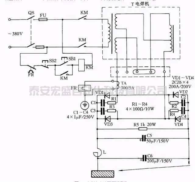 電路中VD1 ~ VD4 為4 只硅整流二極管;R1 ~ R4、C1 ~ C4組成硅整流器件的過壓保護電路;FR 為過流繼電器,保護硅整流器件。當負載電流超過額定值時,電流互感器次級電流相應增加,帶動繼電器FR 動作,F(xiàn)R 常閉觸點打開,接觸器KM 釋放,觸點打開切斷電焊機電源。硅整流器件用0. 25kW 風扇作風冷設備。圖中,C5 為濾波電容,R5 為泄放電阻。