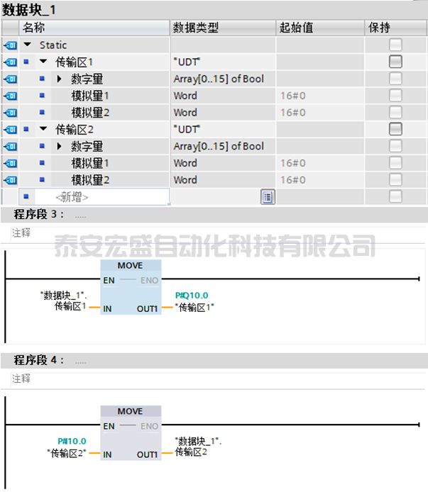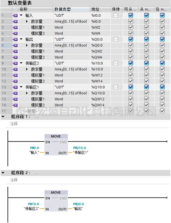 在默認(rèn)變量表中分別定義輸入、輸出、傳輸區(qū)1、傳輸區(qū)2所對應(yīng)的IO數(shù)據(jù)區(qū),這樣就可以使用MOVE指令來整體傳輸了。
