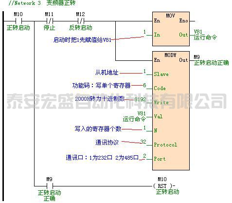 要對變頻器的頻率進(jìn)行命令設(shè)置,只要對其內(nèi)部地址2000H(十進(jìn)制8192)。因此正傳的時(shí)候?qū)懭?,反轉(zhuǎn)寫入2,自由停機(jī)寫入5。