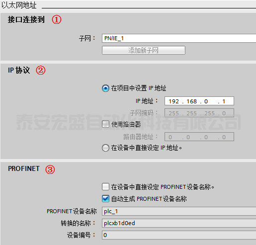 ② “IP 協(xié)議”:默認(rèn)為“在項目中設(shè)置 IP 地址”,此時在項目組態(tài)中設(shè)置 IP 地址,子網(wǎng)掩碼等。如果使用路由器,則激活“使用路由器”,并設(shè)置路由器地址。也可以選擇“在設(shè)備中直接設(shè)定 IP 地址”,則可以在程序中使用指令“T_CONFIG”或者通過在線訪問、Automation Tool、HMI 等方式分配地址,T_CONFIG 修改 IP,詳細(xì)介紹請參見使用 T-CONFIG 指令修改 S7-1200 的 IP 地址和設(shè)備名稱。