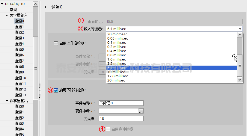 ③ “啟用上升沿或下降沿檢測”:可為每個數(shù)字量輸入啟用上升沿和下降沿檢測,在檢測到上升沿或下降沿時觸發(fā)過程事件。