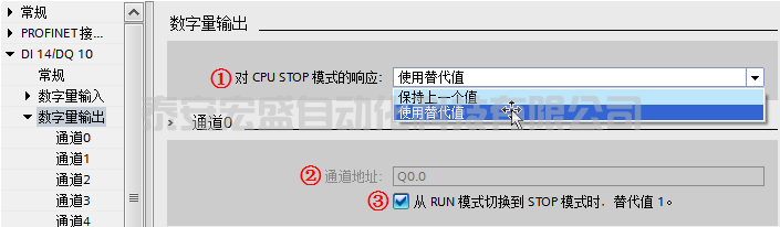 ③ “從 RUN 模式切換到 STOP 模式時,替代值 1”:如果在數(shù)字量輸出設(shè)置中,選擇“使用替代值”,則此處可以勾選,表示從運行切換到停止?fàn)顟B(tài)后,輸出使用“替代值 1”,如果不勾選表示輸出使用“替代值 0”。如果選擇了“保持上一個值”則此處為灰色不能勾選。