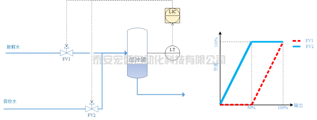 分程控制:先開(kāi)回收水調(diào)節(jié)閥FV2,再開(kāi)新鮮水調(diào)節(jié)閥FV1,使用專(zhuān)門(mén)的分程控制模塊。