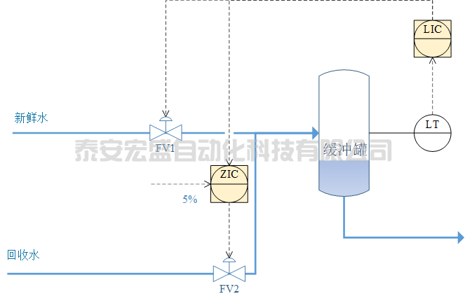 當(dāng)下游用水量大時(shí),回收水調(diào)節(jié)閥FV2全開(kāi),液位測(cè)量值仍達(dá)不到LIC2設(shè)定值,當(dāng)液位測(cè)量值低于LIC設(shè)定值時(shí),LIC會(huì)打開(kāi)新鮮水調(diào)節(jié)閥FV1實(shí)現(xiàn)液位控制。