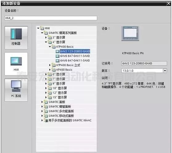 雙擊項(xiàng)目樹中的“添加新設(shè)備”,選中“添加新設(shè)備”對(duì)話框中的KTP400 Basic精簡(jiǎn)面板,不要勾選“啟用設(shè)備向?qū)А睆?fù)選框。單擊“確定”按鈕確認(rèn)。