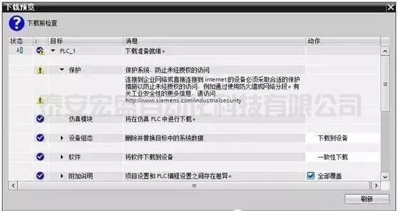 單擊“下載”按鈕,出現(xiàn)“下載預(yù)覽”對(duì)話框,勾選復(fù)選框“全部覆蓋”,編譯成功后,單擊“下載”按鈕,將程序下載到PLC。