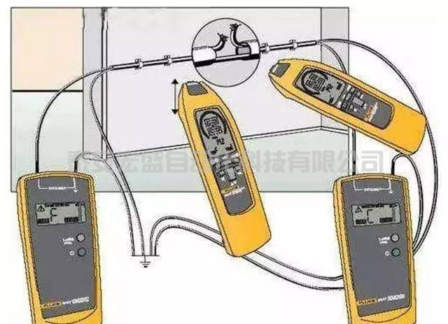 首先排除斷點電纜周圍的電纜有電源,然后將有斷點的電纜接在火線上,然后用感應(yīng)電筆垂直于電纜緩慢移動,當(dāng)感應(yīng)電筆的交流信號消失時,即可判斷斷點在該檢測點處,誤差最多不超過10cm。