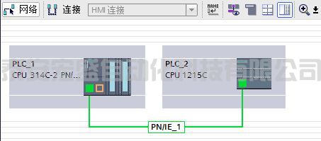 在網(wǎng)絡(luò)視圖下,用鼠標點中 S7-300 上的 PROFINET 通信口的綠色小方框,然后拖拽出一條線,到另外一個 S7-1200 上的 PROFINET 通信口上,松開鼠標,PN/IE_1的子網(wǎng)連接就建立起來了,如圖 6 所示。