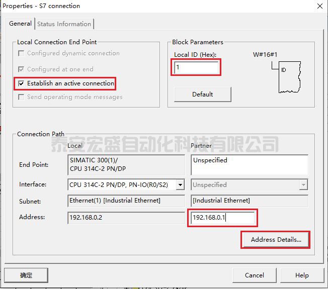 (4)點擊“OK”按鈕后,在彈出的屬性窗口中勾選單端組態(tài)(Establish an active connection),并填寫通信伙伴的 IP 地址,注意 Local ID 編號,本例保持默認值 1,如圖 70 所示。之后點擊地址詳細按鈕(Address Details...)。