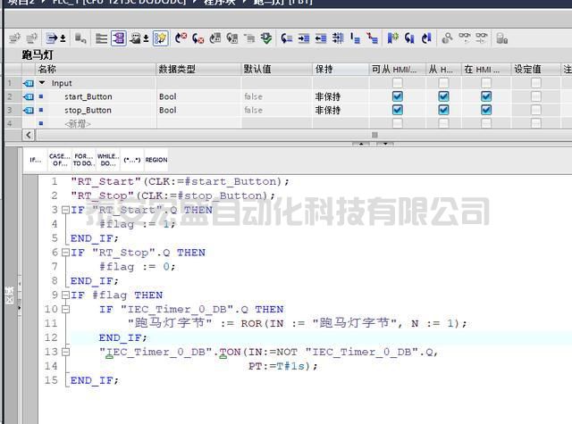 3.在FB函數(shù)塊的接口處定義三個(gè)變量,分別是啟動(dòng)按鈕、停止按鈕、啟動(dòng)標(biāo)志的三個(gè)形參,如下圖所示。