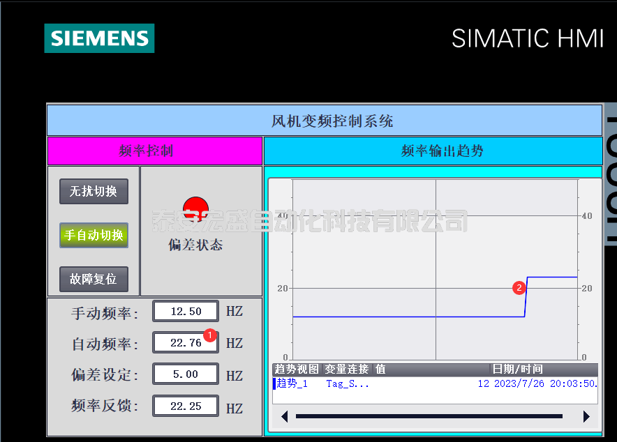 ①如圖1所示:HMI上“無擾切換”切換模式?jīng)]有啟用;“手自動切換”為FALSE,代表的是手動模式;手動頻率給定的是12.5HZ,頻率輸出曲線一直是在12.5HZ。當(dāng)切換到自動模式,如圖2所示,頻率輸出為22.76HZ,曲線可以看出頻率輸出產(chǎn)生了較大的擾動。