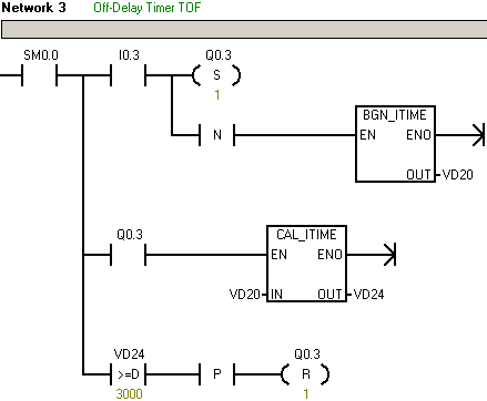 輸入點 I0.3 斷開(下降沿) 3 秒 (3000 ms) 后,輸出點 Q0.3 復(fù)位。