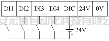 V20變頻器共有4個(gè)光電隔離的數(shù)字量輸入,包括DI1,DI2,DI3和DI4。數(shù)字量輸入可采用變頻器內(nèi)部24V電源供電,也可采用外接24V電源供電;可以接成PNP接法,也可以接成NPN接法。