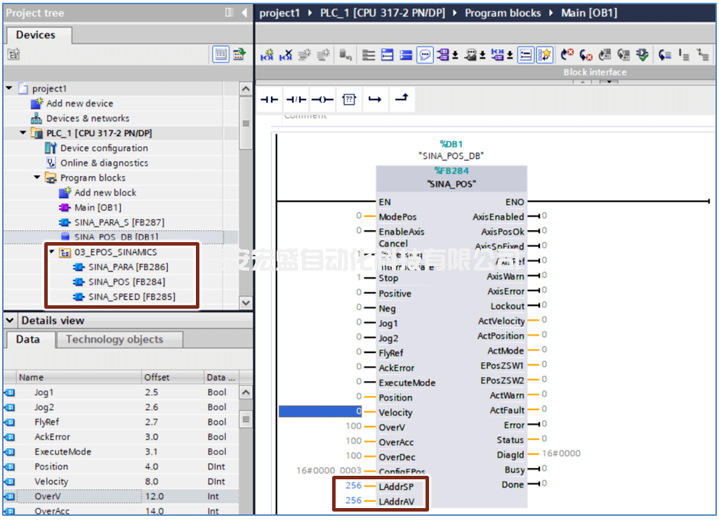 4.在OB1中調(diào)用SINA_POS(FB284) 實現(xiàn)S120的基本定位控制。