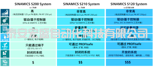 圖3-3中在動態(tài)響應(yīng)、運(yùn)動控制、共直流母線、易于使用、安全功能、系統(tǒng)及價格幾方面顯示了S200、S210和S120系統(tǒng)組合的差異,為大家的選型提供了參考,可以根據(jù)不同的需求選擇不同的伺服驅(qū)動器。