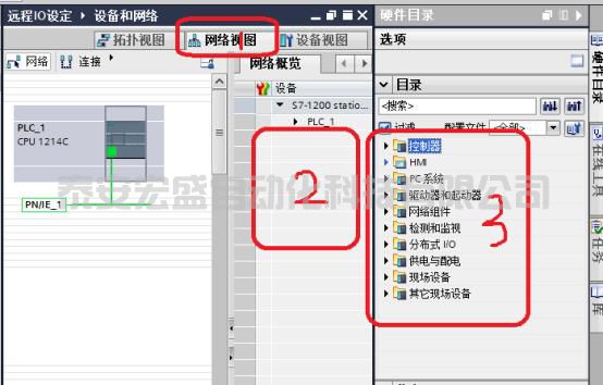 5、如下圖所示在右側(cè)目錄中可以看到有很多可添加的模塊選項,在網(wǎng)絡(luò)視圖中目前沒有添加任何模塊,添加西門子品牌的遠程I/O在目錄內(nèi)即可找到想要添加的模塊型號,比較簡單,我們重點總結(jié)一下其他第三方模塊的添加方法;