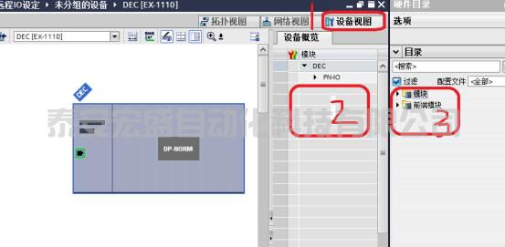 14、接下來我們需要將遠程I/O模塊添加IN,OUT點,在網(wǎng)絡(luò)視圖內(nèi)點擊選中剛添加完成的模塊,點擊設(shè)備視圖,進入模塊的設(shè)定;如下圖所示;此時在2位置沒有I/O點位顯示,3位置可以看到可以供添加的I/O擴展模塊;
