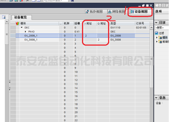 17、硬件添加部分就完成了,下面來看一下添加的I/O模塊地址如何查看,在網(wǎng)絡(luò)視圖中選中添加的設(shè)備,點擊右上角“設(shè)備視圖”這時可以看到設(shè)備概覽也顯示了相關(guān)信息,將窗口向左拉大,就可以看到剛添加的I/O模塊的輸入,輸出開始地址,第一個輸入模塊的第一個輸入點即為“I2.0”輸出第一個點為“Q2.0”