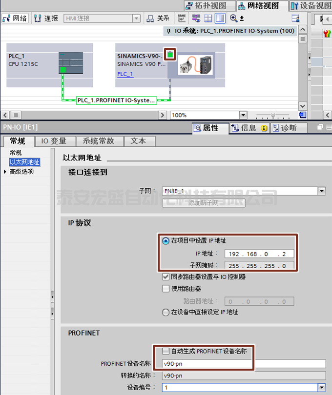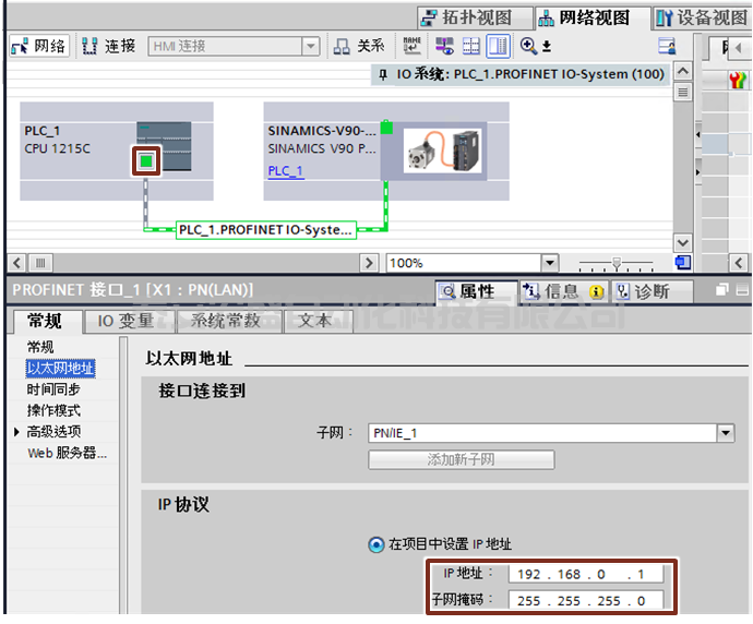 2. 建立V90 PN與PLC的網(wǎng)絡連接,并分別設置S7-1200及V90 PN的IP地址及設備名稱: