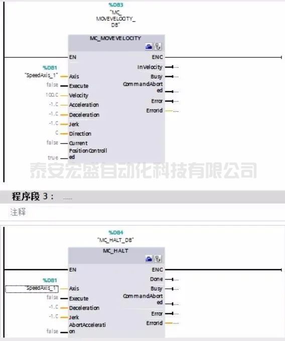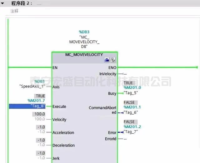 如果要停止就給MC_HALT功能塊信號。要注意使用該速度功能塊不能連續(xù)調(diào)整速度。每次設(shè)定速度值后需要再次給Execute信號。