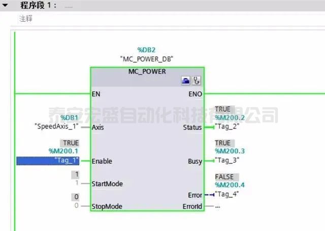 在OB1中添加功能塊,MC_POWER,在Axis輸入端選擇之前添加的速度軸。